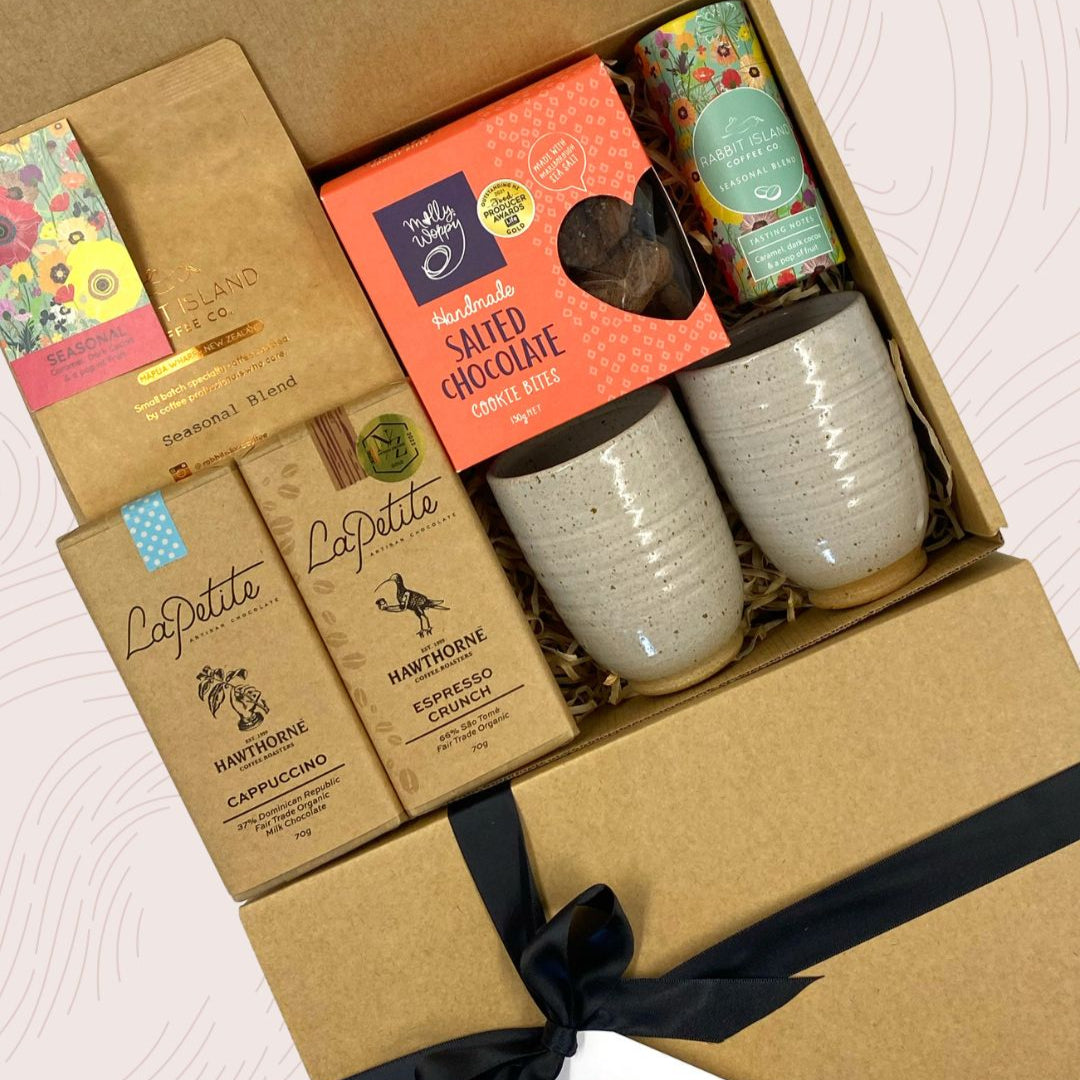 At the heart of this gift box are two handcrafted Mahora Pottery Tumblers. We've also included two indulgent La Petite chocolates and the Salted Chocolate Cookie Bites from Molly Woppys. Made with the finest ingredients and infused with the rich, bold flavors of coffee, these are a decadent indulgence that will perfectly complement your morning cup of Rabbit Island coffee.