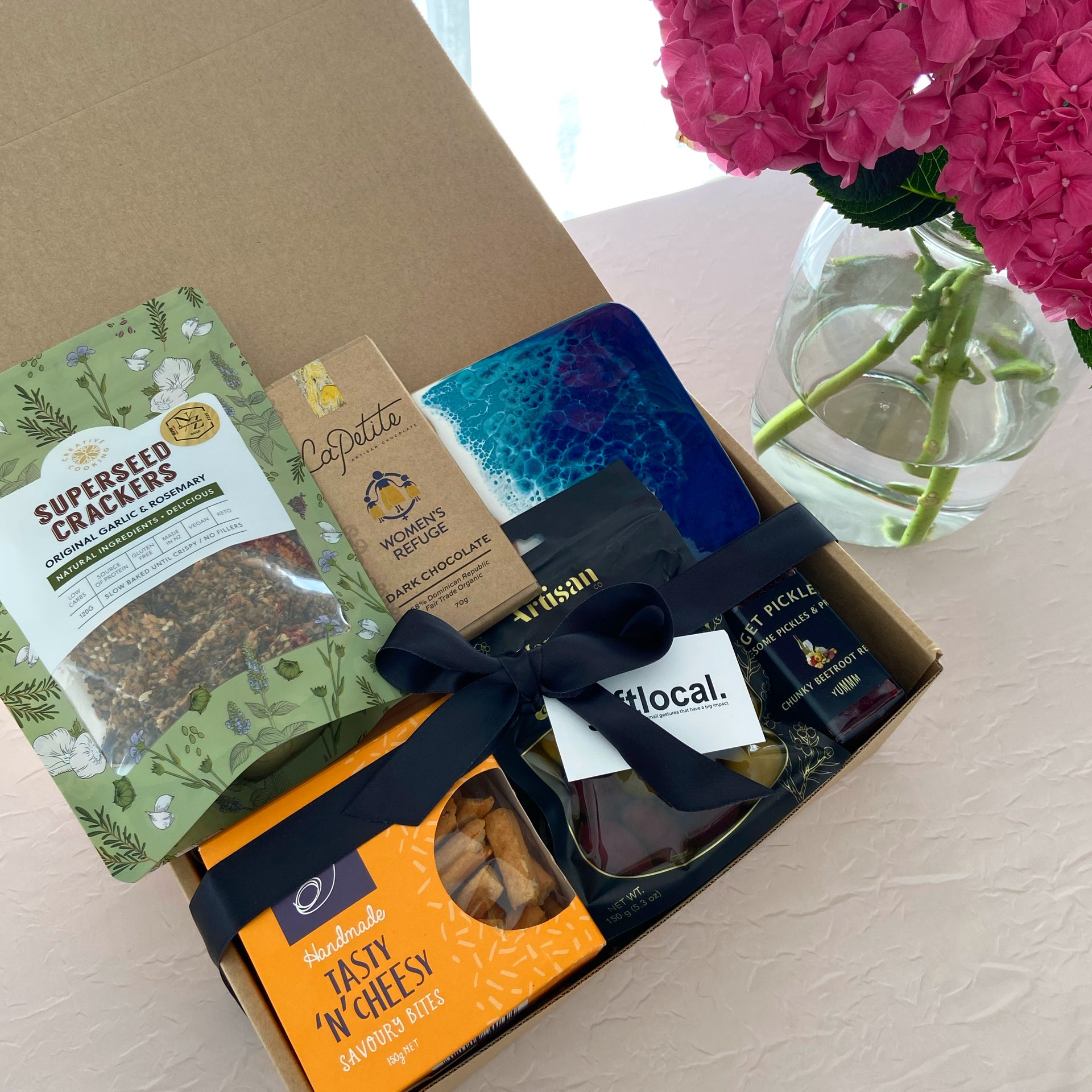 As easy as one, two, cheese! It's snack time with this cracker of a gift box filled with a fine selection of New Zealand's yummiest snacks served on a beautiful hand made resin board, ready to create the perfect cheese and wine moment.