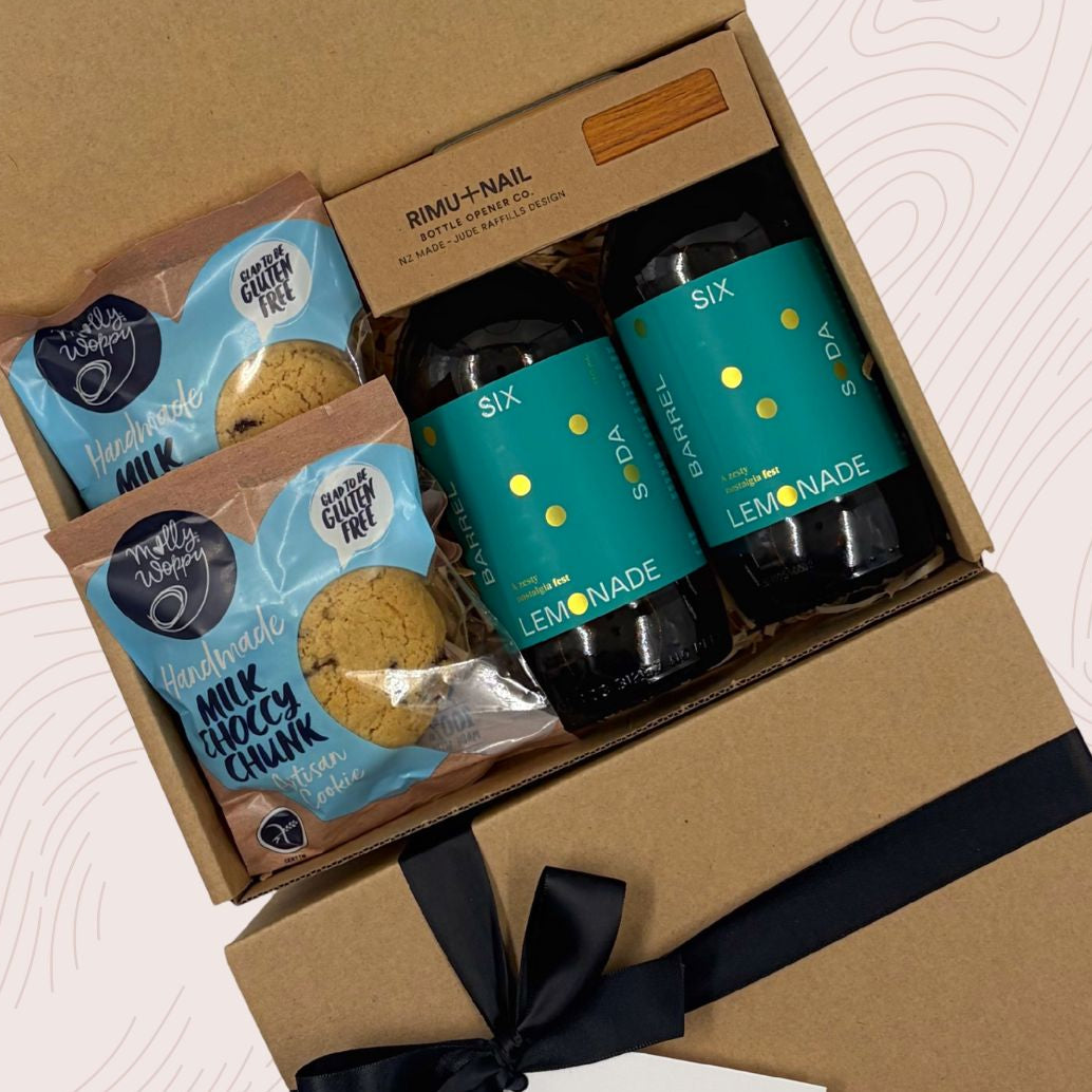 Our Sip & Snack gift box is one of the newest in our range, featuring the most refreshing lemonade soda, a beautiful rimu bottle opener and 2 x cookies to snack on.